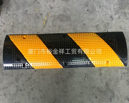 橡膠減速帶,材質為橡膠材料,外形為坡面,顏色往往黃黑相見,用膨脹螺絲固定到道路路口,是起到車輛減速作用的安全設施。